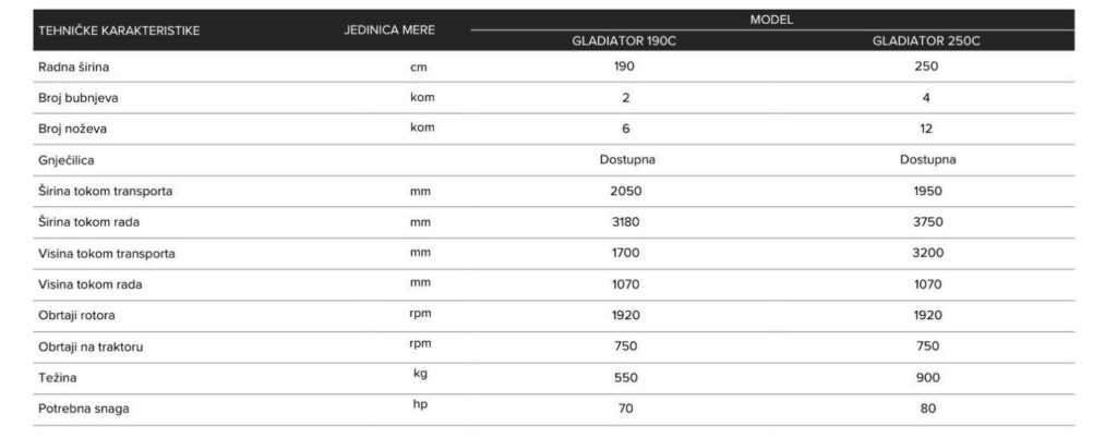 Gladiator pozadinske bubnjaste kosilice sa hidrauličnim sistemom razvijene su u dimenzijama 190 i 250 cm, opremljene kondicionerima za seno sa gumenim valjcima, koji ubrzavaju proces sušenja i omogućavaju proizvodnju stočne hrane izvanrednog kvaliteta. Lateralne bubnjaste kosilice optimizuju vreme sakupljanja stočne hrane, čime poboljšavaju proizvodne brzine.